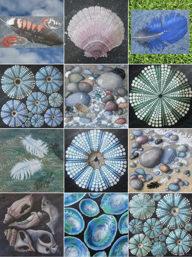 A screen shot of some of the artwork images Jo has posted on her instagram account, over thirty to date. As instagram posts are restricted to a square, to avoid needing to crop her artwork images painted on landscape and portrait canvas sizes she has opted to add photoshopped backgrounds to create a square, which are not part of the original artwork. The photos used are photos Jo has snapped of our beautiful natural world.